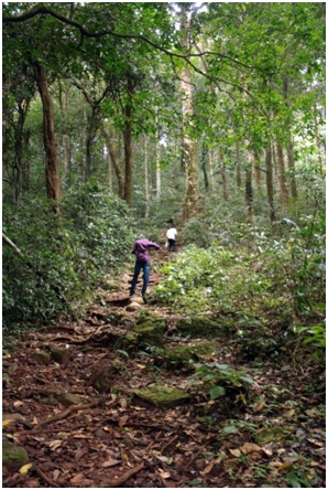 The base of the trek is 5km from this village. There will be autos in the village which will ferry the people to the trek entrance. There’s a forest department demarcation at the entrance, where a left turn must be taken to get into the forests. It is a 2 day trek with 7-9 hr ascent done during the Day1 and 4 hour descent done on the day2 with camping just beneath peak. The trek is about 9kms one way to the peak. Straight away into marshy forests, where the leeches are in great numbers, take required precautions to scare the leeches away. The initial 3.5 km is through the tropical semi-evergreen forests and it is here that it is cooler under the shade. And it is an easy tread with the regular ascent and descent and with no much altitude gaining.